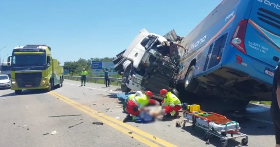 Uma colisão entre um caminhão e um ônibus na região sul do Rio Grande do Sul, em um trecho da BR-116, deixou ao menos 11 mortos nesta sexta-feira (2). O número foi confirmado pela PRF (Polícia Rodoviária Federal) e pela concessionária Ecovias Sul.