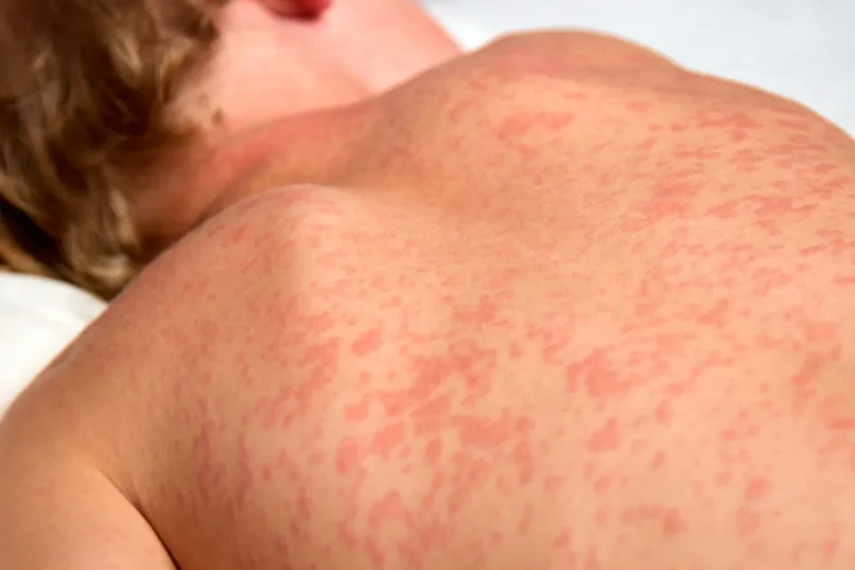 O sarampo é uma doença aguda, transmitida por gotículas emitidas por tosse, fala ou espirro. O vírus possui período de encubação de até 14 dias e os sintomas costumam ser febre, dor de cabeça, manchas no corpo.