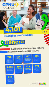 No Acre, as mulheres representam 59,5% do total de inscritos, com 2.440 confirmações. Candidatos do sexo masculino somam 1.661, ou 40,5%.