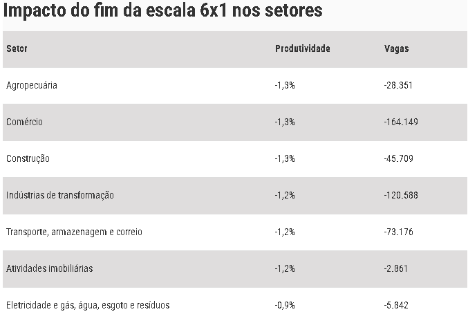 O fim da escala 6×1, se aprovada pelo Congresso Nacional, poderia acabar com 600 mil empregos no Brasil, segundo nota técnica do CLP (Centro de Liderança Pública). Os setores mais impactados, de acordo com o documento, seriam o agro, o comércio e o segmento de construção.