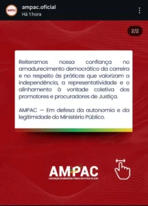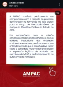 No comunicado, a AMPAC parabeniza os concorrentes e reforça que, embora a lei não obrigue o governador a escolher o mais votado, essa prática “fortalece a lógica democrática e prestigia a vontade da classe”. Por isso, a entidade manifesta apoio explícito à nomeação do primeiro colocado.