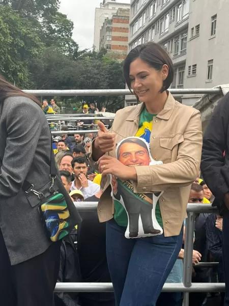 7.set.2025 – Michelle Bolsonaro, ex-primeira-dama, segura boneco do marido Jair Bolsonaro durante ato na avenida Paulista -Imagem: Adriana Negreiros/UOL