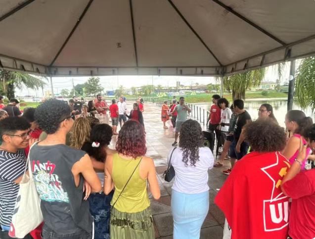 Os manifestantes ficaram embaixo de uma tenda para se proteger do sereno e usaram um microfone para criticar a aprovação do PL. Representantes de movimentos sociais reforçaram a luta em favor da democracia e afirmaram ‘estarem vivendo a continuidade da tentativa de golpe de 8 de janeiro’.