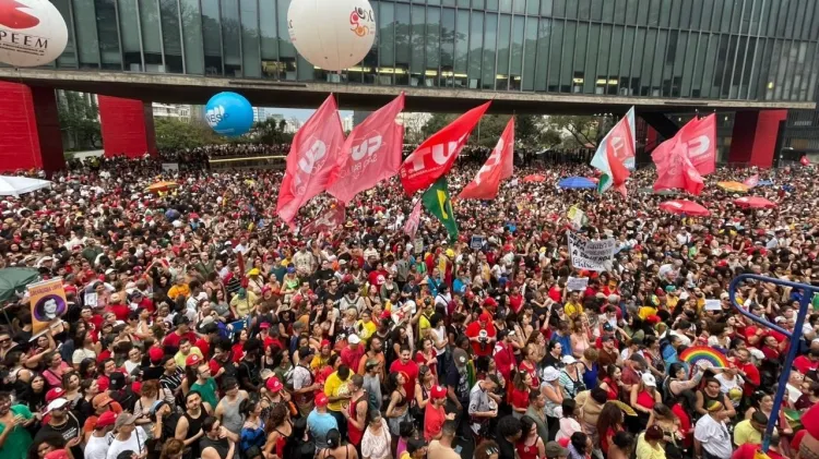 Parte do público na Paulista está de vermelho e carrega símbolos de partidos de esquerda e movimentos sociais