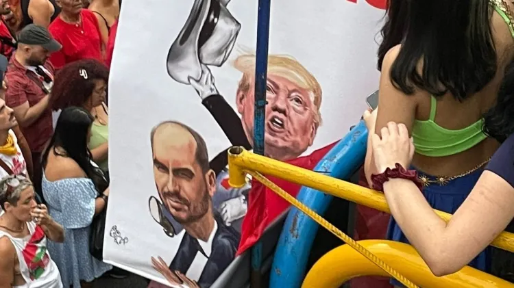 Manifestantes criticaram políticos de direita. Dois dos principais alvos foram o governador paulista, Tarcísio de Freitas (Republicanos), que ganhou vaias do público, e o deputado federal Eduardo Bolsonaro (PL), que teve sua imagem exibida em cartazes em que aparece com o presidente Donald Trump montado nas costas e “vassalo” escrito.