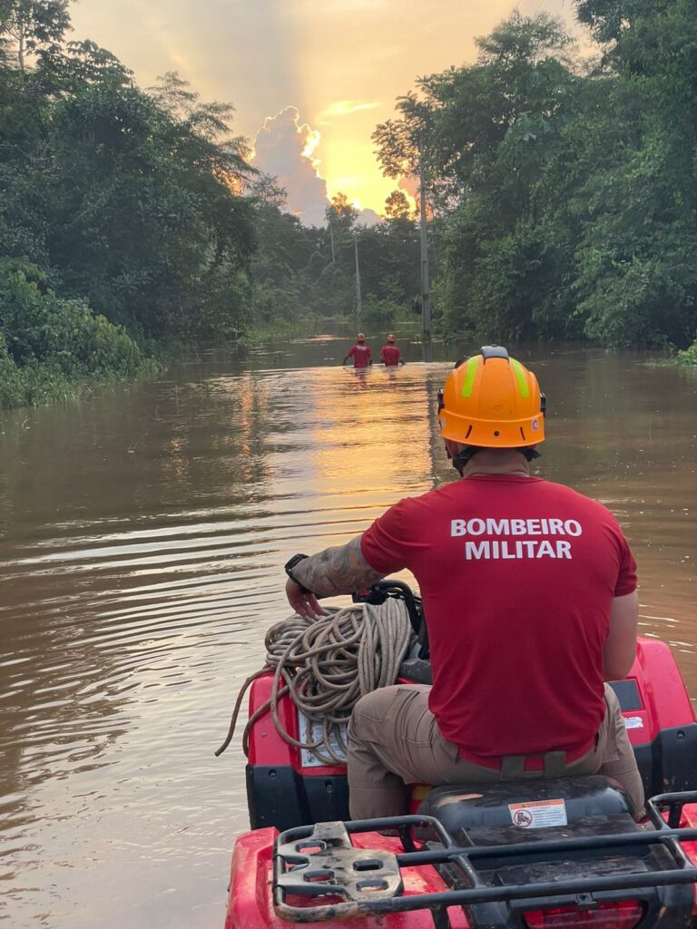 O CBMAC foi a primeira resposta. Em quadriciclo, a pé e com tentativa de progressão por motonáutica, os bombeiros avançaram onde era possível, superando lama, água e longos deslocamentos. Diante da inviabilidade do resgate terrestre, que poderia durar toda a noite e expor a gestante a riscos adicionais, a equipe realizou a estabilização inicial da paciente, com apoio técnico do Samu, incluindo medicação e acompanhamento profissional.