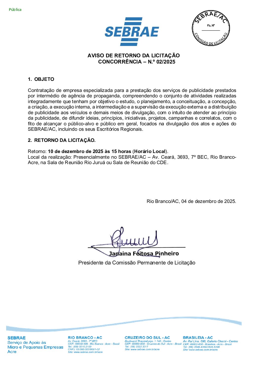 AVISO DE RETORNO DA LICITAÇÃO CC 02 2023 – PUBLICIDADE