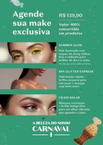 Entre as propostas estão a “Carna Glow”, com pele iluminada e fresca; a “Colour Splash”, com cores vibrantes e brilho; e a “Olhar Resistente”, focada em alta fixação e durabilidade. A ideia é transformar a loja no ponto de partida para a produção carnavalesca, com looks que resistem ao calor e acompanham o ritmo da festa. Agendamentos podem ser feitos pelo site da marca.