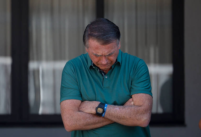 Um homem está de pé, com os braços cruzados e a cabeça baixa, demonstrando uma expressão de reflexão ou tristeza. Ele usa uma camisa polo verde e um relógio no pulso. Ao fundo, há uma janela com cortinas.Um dos mensageiros que deve se encontrar com o deputado federal nos EUA é o deputado Sóstenes Cavalcante (PL-SP), que visitou Bolsonaro na semana passada. Ele nega que se reunirá com o parlamentar.