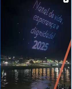 O ponto alto da apresentação foi a formação de frases que ecoaram o sentimento da festividade. No alto, os drones desenharam as mensagens “Feliz Natal” e “Natal de vida, esperança e dignidade”. A cada letra formada, o público reagia com aplausos e muitos registros por meio de celulares, eternizando o momento em que a tecnologia se uniu à tradição.