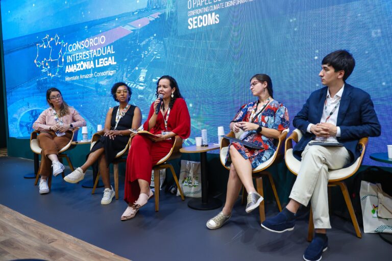 A secretária de estado de comunicação do Acre e coordenadora da Câmara Temática de Comunicação do Consórcio da Amazônia Legal, jornalista Nayara Lessa, foi uma das painelistas, na tarde desta quinta-feira, 13, do debate intitulado “Desinformação sobre clima: o papel e a sustentabilidade do jornalismo”, na COP30, em Belém do Pará.
