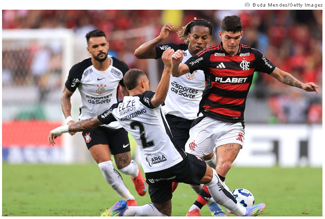 O duelo entre Corinthians e Flamengo, pela 25ª rodada do brasileirão, terá transmissão em TV abera (Record), pay-per-view (Premiere) e YouTube (Cazé TV).