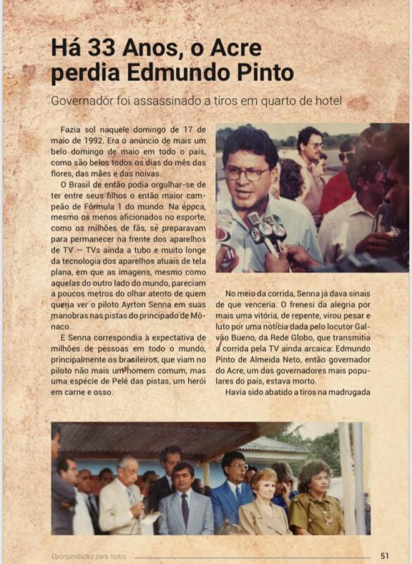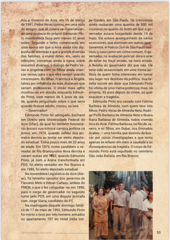 Mas Edmundo teve pouco tempo para governar, pois foi assassinado na madrugada do dia 17 de maio de 1992, com dois tiros de revólver, no apartamento 704 de Della Volpe Garden Hotel, no centro de São Paulo (SP), um crime de chocou o Acre e o Brasil.Com a morte de Edmundo, quem assumiu o governo foi o vice-governador Romildo Magalhães, que fora deputado estadual. Romildo ficou no comando até o dia 31 de dezembro de 1994, sendo sucedido pelo ex-prefeito de Cruzeiro do Sul, empresário Orleir Cameli, tio do atual governador Gladson Cameli.