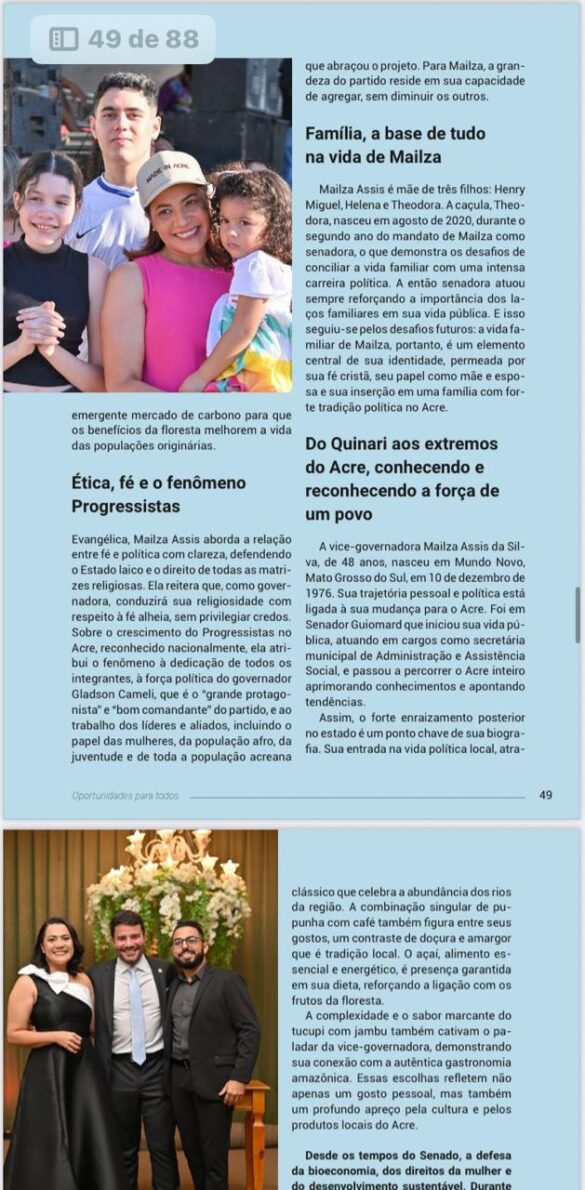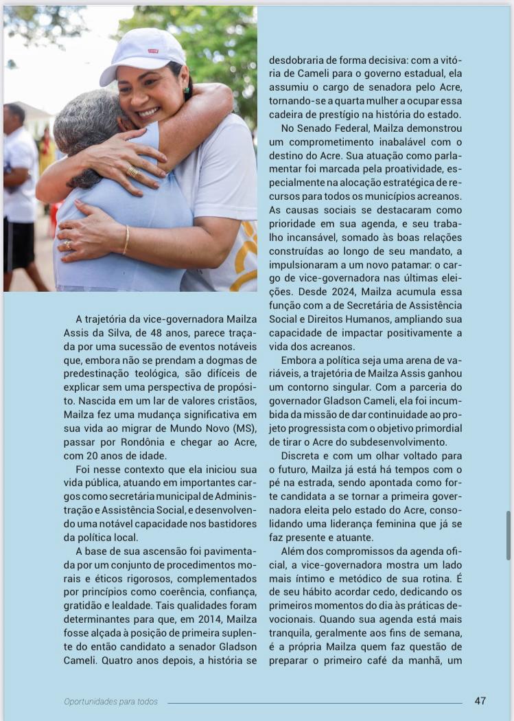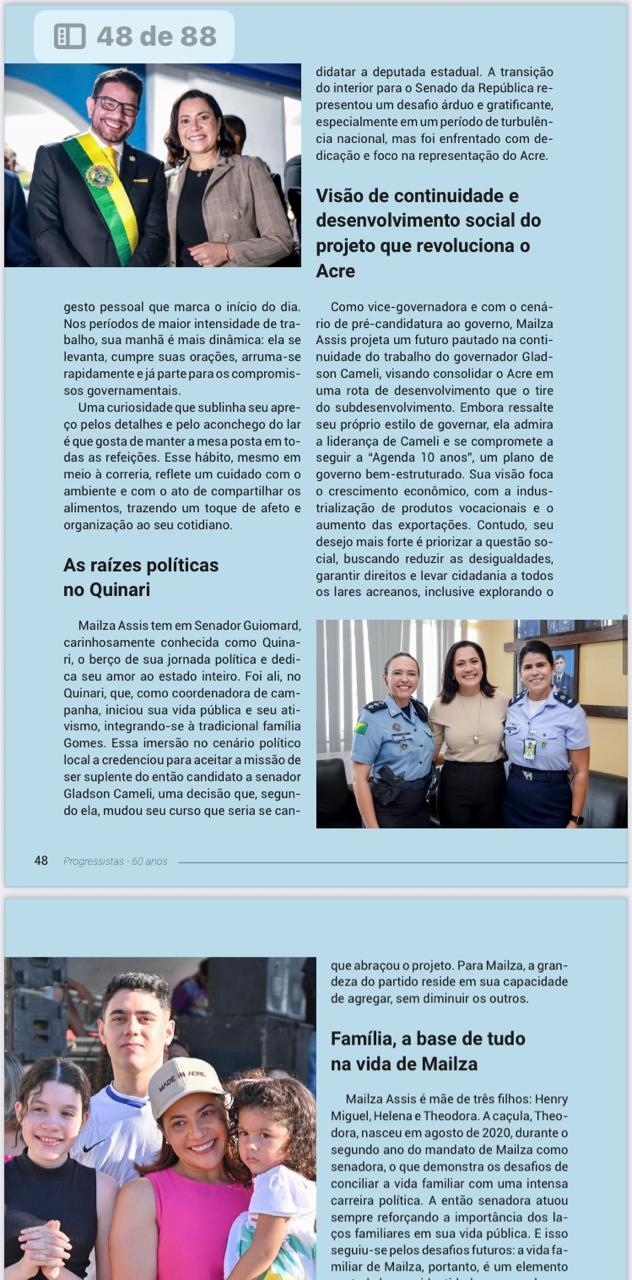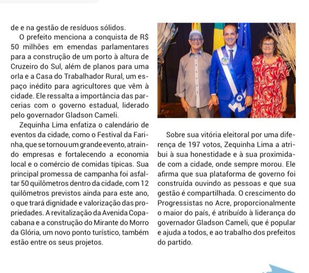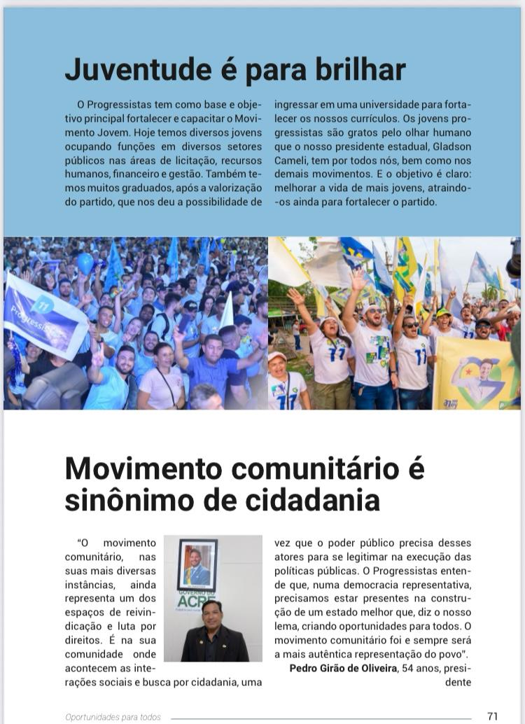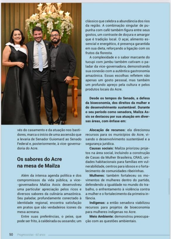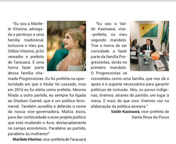 O futuro é simbolizado pela vice-governador e futura governadora, Mailza Assis, além dos 14 prefeitos, quatro vice-prefeitos e os 69 vereadores espalhados nos 22 municípios acreanos. As lideranças do PP, especialmente as mulheres apostam no potencial de Mailza como sucessora do governador Gladson Cameli. Ela já foi presidente regional do PP e conseguiu fazer excelente trabalho, sobretudo no que se refere o fortalecimento da sigla na capital e no interior, sobretudo no vale do Juruá, que reconquistou a Prefeitura com Zequinha Lima; em Sena Madureira, com o prefeito Gerlen Diniz; em Assis Brasil, na tríplice fronteiro do Brasil com Peru e Bolívia, com o prefeito Jerry Correia em Xapuri, cidade história por ser o berço da Revolução Acreana, com o prefeito Maxuel Maia e, em Porto Acre, com o prefeito Máximo Costa. Porto Acre também é uma cidade Histórica, afinal, foi lá o cenário da batalha final da Revolução Acreana, em 24 janeiro de 1903.