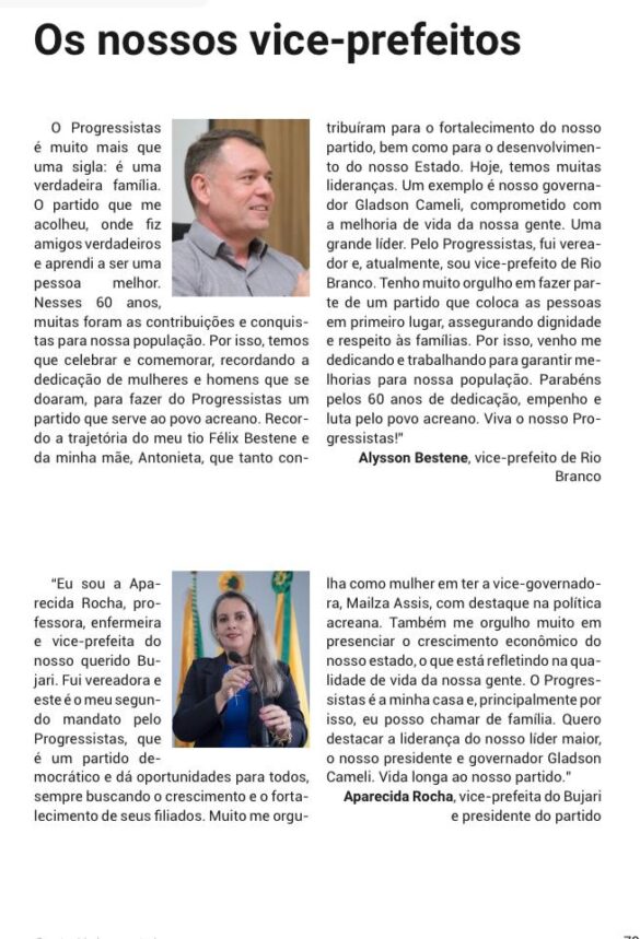 O vice-prefeito de Rio Branco, Alysson Bestene destacou a contribuição de lideranças históricas, como os ex-governadores Edmundo Pinto, Jorge Kalume e Raimundo Hermínio de Melo, e agradeceu ao Legislativo pelo reconhecimento. “O Progressistas tem passado, presente e futuro. São guerreiros acreanos que lutam por esse povo e por essa terra. Me orgulho de fazer parte dessa história”, declarou.
