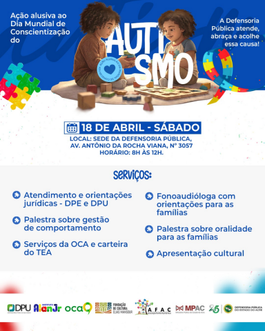 A Defensoria Pública do Estado do Acre (DPE/AC) realiza, neste sábado (18), uma ação especial em alusão ao mês de conscientização do autismo. A programação ocorre das 8h às 12h, na sede da instituição, localizada na Avenida Antônio da Rocha Viana.