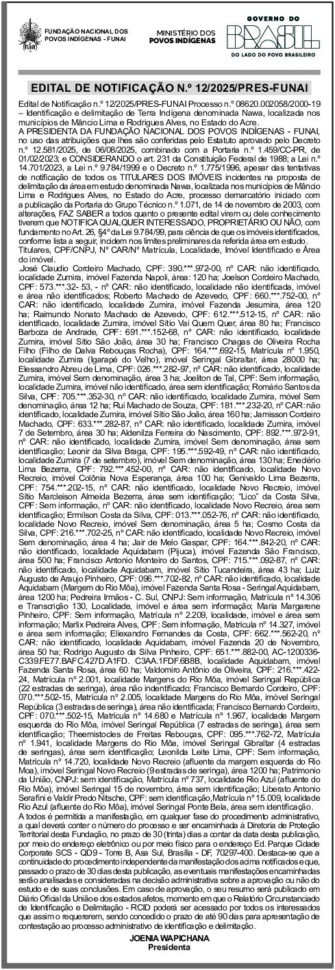 Edital de Notificação n.º 12/2025/PRES-FUNAI