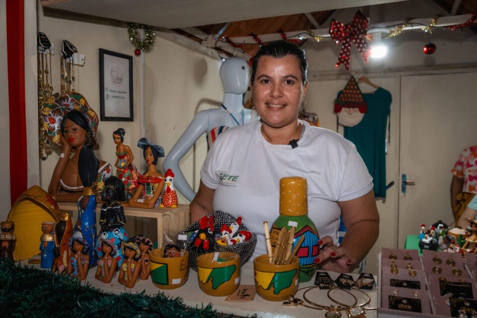 Em uma das lojinhas da Vila Natalina, montada em frente ao Palácio Rio Branco pelo governo do Acre, e coordenada pela Secretaria de Estado de Turismo e Empreendedorismo (Sete) em parceria com a Associação Comercial, Industrial, de Serviço e Agrícola do Acre (Acisa), a empreendedora mostra com conhecimento de causa as peças que produz: