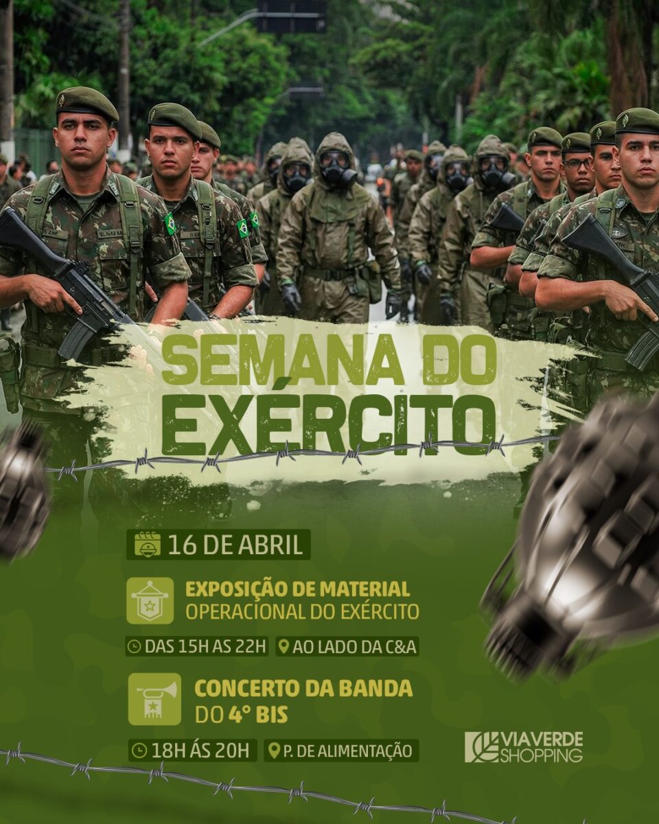 O Exército Brasileiro promoverá, na quarta-feira, 16 de abril, uma semana alusiva no Via Verde Shopping. A programação será realizada ao lado da loja C&A e incluirá exposição de materiais operacionais que será aberto ao público das 15h às 22h, além da exposição terá ainda um concerto especial da Banda do 4° Batalhão de Infantaria de Selva (BIS), com apresentação prevista das 18h às 20h. A iniciativa tem como objetivo aproximar a instituição militar da comunidade civil, promovendo conscientização sobre a atuação e os valores das Forças Armadas Brasileiras.