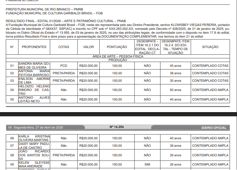 A Fundação Municipal de Cultura Garibaldi Brasil (FGB) publicou, na edição desta segunda-feira (27) do Diário Oficial do Estado (DOE), a lista dos projetos selecionados pelo Edital 01/2026 – Arte e Patrimônio Cultural. O certame marca um investimento robusto de R$ 1,6 milhão no setor cultural da capital acreana, mas também chama a atenção pelo alto nível de competitividade e rigor técnico.