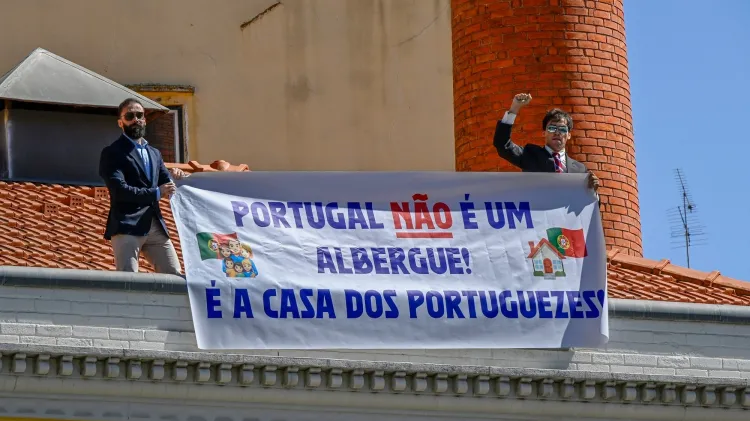 Manifestantes anti-imigração levantam cartaz em Lisboa contra a permanência de estrangeiros em Portugal durante protesto contra o endurecimento de leis migratórias no país