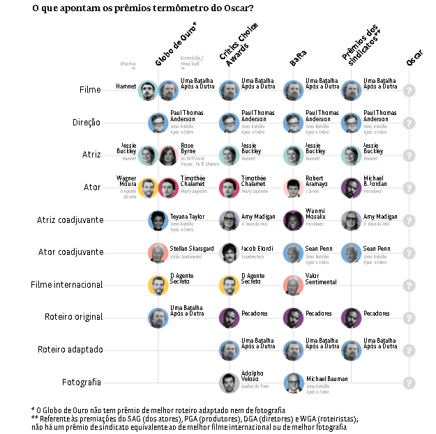 “Pecadores” lidera as indicações, com 16, seguido por “Uma Batalha Após a Outra”, com 13. O norueguês “Valor Sentimental”, principal rival de “O Agente Secreto”, foi indicado sete vezes.
