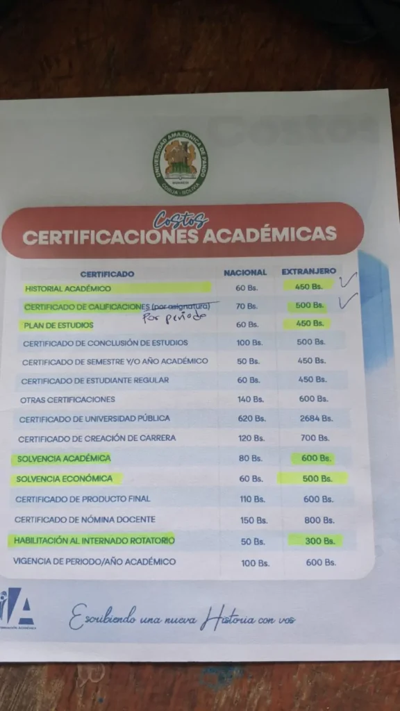 Segundo os universitários, valores que antes variavam entre 50 e 100 bolivianos (Bs) agora ultrapassam 500, 600 e chegam a até 2.875 bolivianos, especialmente para os alunos de outros países. Em uma diferença que está sendo classificada como escandalosa, um estudante brasileiro pode pagar até dez vezes mais que um aluno local por alguns documentos essenciais.