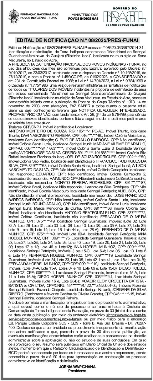 EditaisFUNDAÇÃO NACIONAL DOS POVOS INDÍGENAS Edital de Notificação n.º 08/2025/PRES-FUNAI Compartilhe: