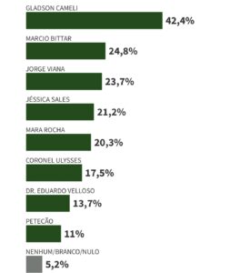 Em um primeiro cenário, o atual governador tem 42,4%, enquanto o parlamentar aparece com 24,8%. Em seguida aparecem o ex-senador Jorge Viana (PT-AC) com 23,7%, a ex-deputada federal Jéssica Sales (MDB-AC) com 21,2%, Mara Rocha (MDB-AC), também ex-deputada, com 20,3%.