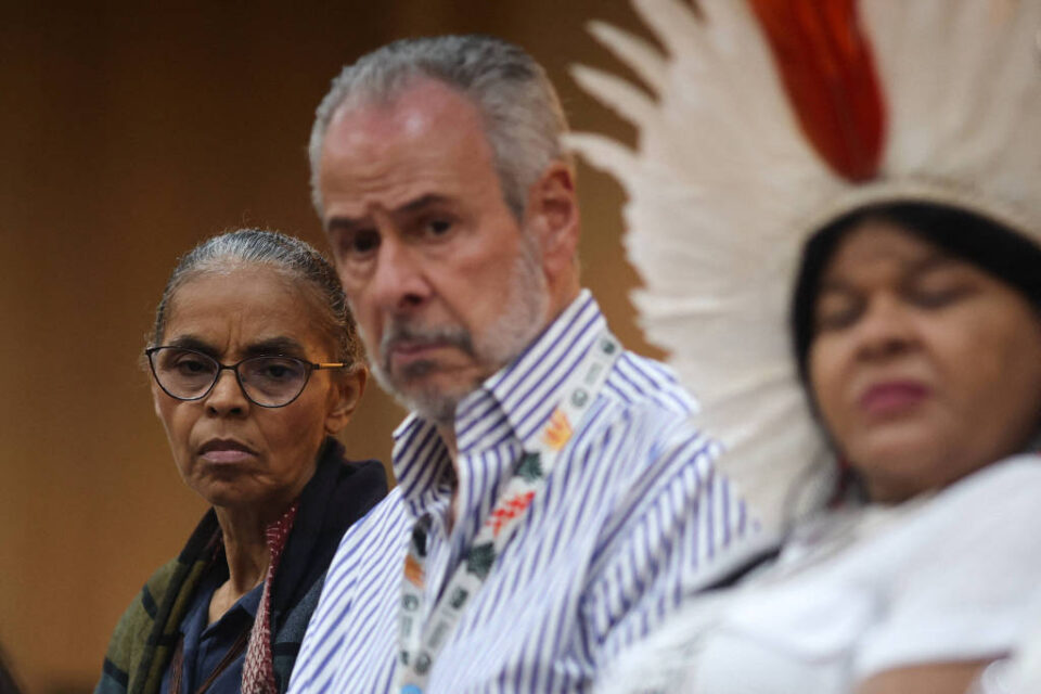 A ministra Marina Silva (Meio Ambiente), o presidente da COP30, André Corrêa do Lago, e a ministra Sônia Guajajara (Povos Indígenas) durante encontro com líderes indígenas na COP30, em Belém, nesta sexta (14) – Adriano Machado/Reuters