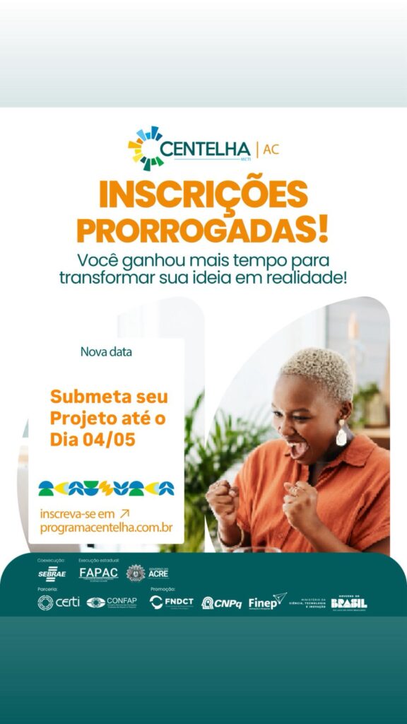 O governo do Acre, por meio da Fundação de Amparo à Pesquisa do Estado do Acre (Fapac), em parceria com a Secretaria de Estado de Indústria, Ciência e Tecnologia (Seict), anuncia a prorrogação do prazo para inscrições no programa Centelha 3, que seguem abertas até o dia 4 de maio. A iniciativa, que visa fomentar o empreendedorismo inovador, busca transformar ideias em negócios de base tecnológica que contribuam para o desenvolvimento econômico de setores estratégicos no Estado.