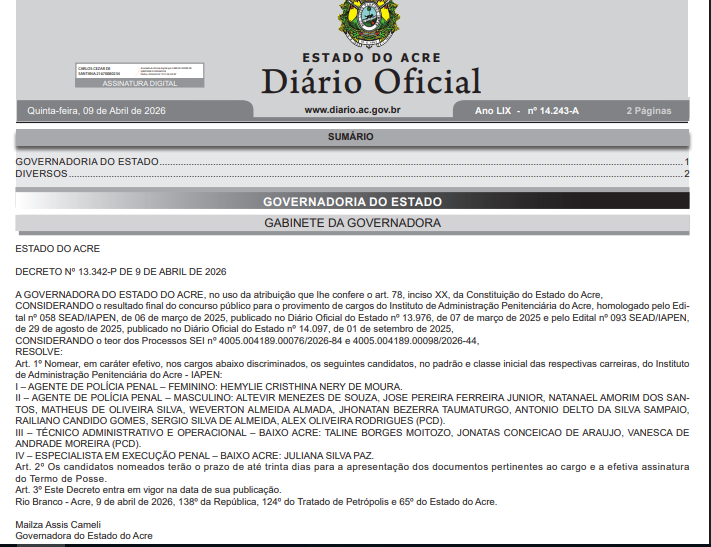 O Governo do Estado do Acre oficializou, nesta quinta-feira (9), a nomeação dos candidatos aprovados no concurso público do Instituto de Administração Penitenciária (Iapen). A lista de convocados foi publicada em uma edição extra do Diário Oficial do Estado (DOE), sinalizando o início de uma nova fase para o fortalecimento do sistema prisional acreano.