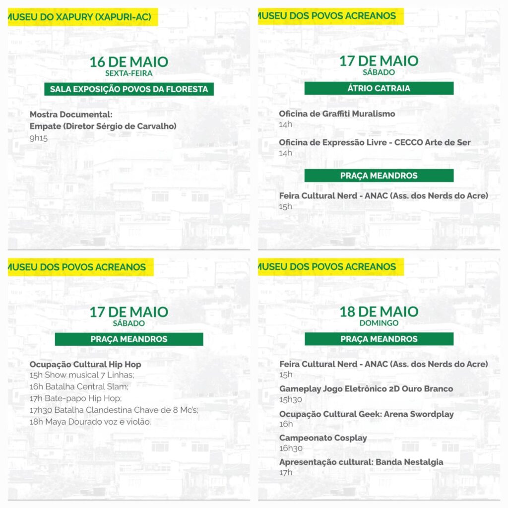 Na sexta-feira, a agenda cultural continua com a apresentação da banda Saudades do Seringal, às 9h, no Átrio Catraia, no MPA. No fim da tarde, às 17h30, será encenada a peça teatral Fiandeiro de Tempos, do ator, pesquisador e produtor Victor Onofre.