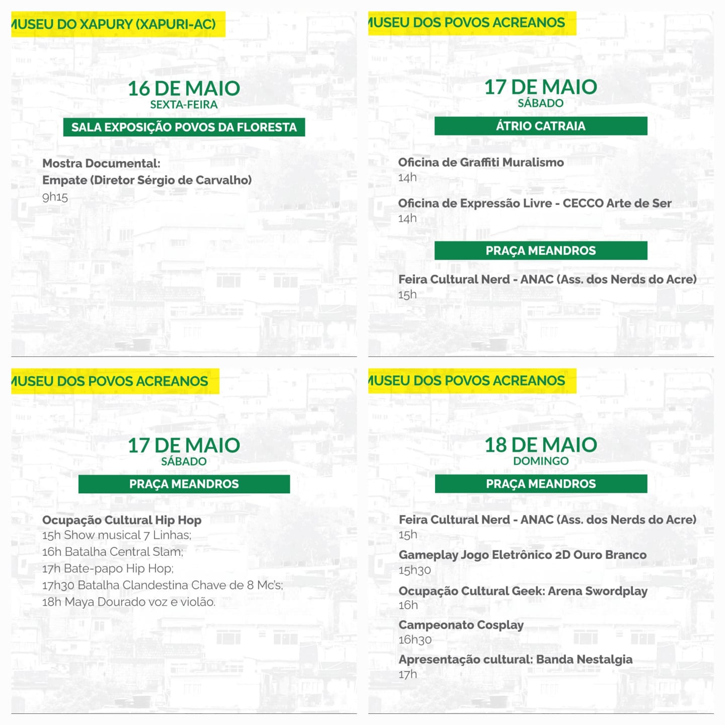 Coordenada no Acre pela Fundação de Cultura Elias Mansour (FEM), com apoio do governo do Estado, a edição local propõe atividades voltadas a três eixos principais: juventude, tecnologias e patrimônio imaterial.