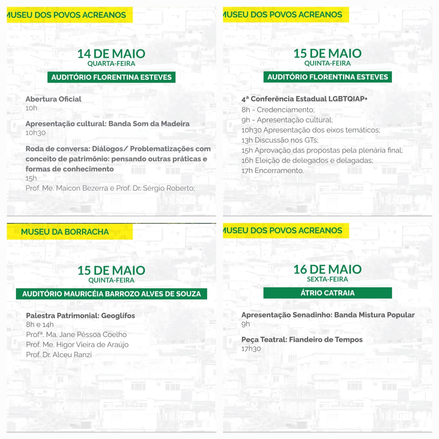A abertura oficial do evento contará na quarta-feira com a presença de autoridades, de representantes da Academia Acreana de Letras e apresentação artística. À tarde, será realizada uma roda de conversa com os professores da Universidade Federal do Acre, Maicon Bezerra e Sérgio Roberto Souza, com foco em práticas e formas de conhecimento relacionadas ao conceito de patrimônio.