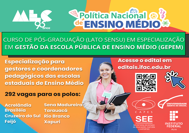 O Instituto Federal do Acre (Ifac), por meio do campus Rio Branco, está com inscrições abertas para o curso de Especialização em Gestão da Escola Pública de Ensino Médio (Gepem), ofertado na modalidade Educação a Distância (EaD), por meio do Programa Universidade Aberta do Brasil (UAB).
