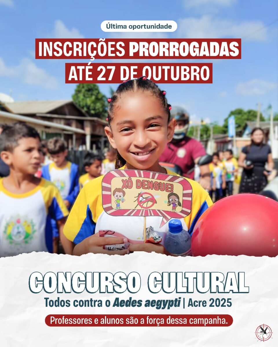 A organização do projeto “Todos Contra o Aedes Aegypti – Edição Acre 2025” prorrogou o prazo de inscrições do Concurso Cultural destinado a professores e alunos do 3º e 4º anos do ensino fundamental de escolas públicas dos municípios de Rio Branco, Cruzeiro do Sul, Capixaba, Feijó, Mâncio Lima, Senador Guiomard, Sena Madureira, Rodrigues Alves, Tarauacá e Xapuri. Agora, os interessados poderão se inscrever até o dia 27 de outubro de 2025.