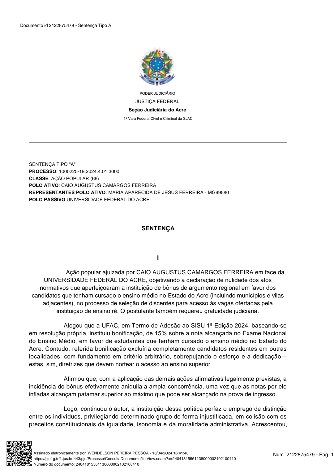 O juíz da primeira vara do Acre, Wendelson Pereira Pessoa, julgou improcedente e acolheu o pedido da Universidade Federal do Acre para o retorno do bônus regional.