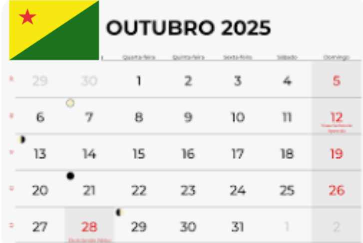 | Governo do Acre | 31 de outubro (Sexta-feira) | Visa feriado prolongado e participação em confraternização. |