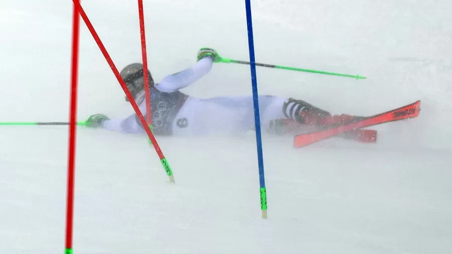 Lucas Pinheiro Braathen, do Brasil, cai na primeira descida no slalom do esqui alpino nos Jogos de Inverno