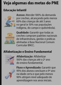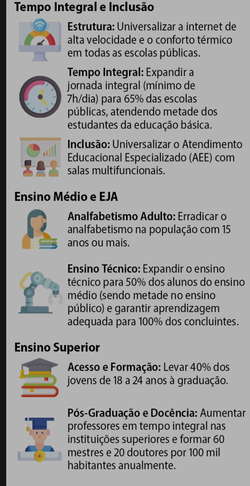 Alfabetização: A meta é garantir que 80% das crianças estejam plenamente alfabetizadas ao final do 2º ano do Ensino Fundamental até o quinto ano do plano, com universalização total ao final dos dez anos.