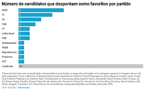 Levantamento feito pelo Estadão com base em pesquisas eleitorais de diferentes institutos em todos os Estados brasileiros e o Distrito Federal mostra que MDB, PL e PP são as siglas com mais pré-candidatos despontando como favoritos. Ainda é cedo, porém, para concluir se a tática bolsonarista dará certo ou será minada pelas alianças regionais do PT com partidos de centro e do Centrão, sobretudo no Nordeste.