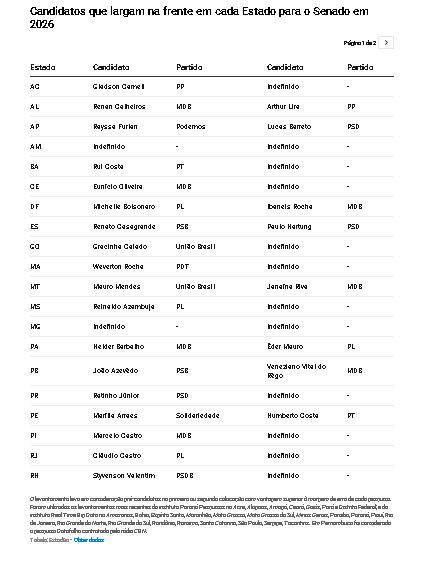 O critério utilizado para definir os nomes que largam na frente foi a vantagem superior à margem de erro em um ou mais cenários testados pela pesquisa – em parte dos casos, políticos que já declararam publicamente que serão candidatos a outros cargos, como governador, foram desconsiderados.