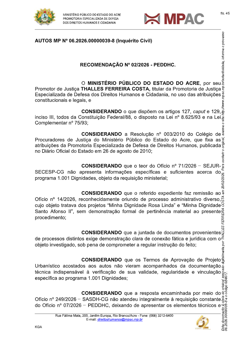 RIO BRANCO, ACRE – O Ministério Público do Estado do Acre (MPAC) recomendou que a Prefeitura de Rio Branco apresente, em um prazo máximo e improrrogável de 15 dias, a documentação completa relativa ao programa habitacional “1.001 Dignidades”. A iniciativa, coordenada pela Promotoria Especializada de Defesa dos Direitos Humanos e Cidadania, visa assegurar a transparência e a viabilidade técnica do projeto, buscando evitar futuras disputas judiciais.