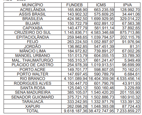 A Secretaria de Estado da Fazenda do Acre (Sefaz-AC) publicou no Diário Oficial desta segunda-feira, 8 de setembro, o demonstrativo de arrecadação estadual referente ao mês de agosto de 2025. O relatório apresenta os valores destinados aos municípios acreanos, provenientes de três principais fontes de receita: Fundeb, ICMS e IPVA.