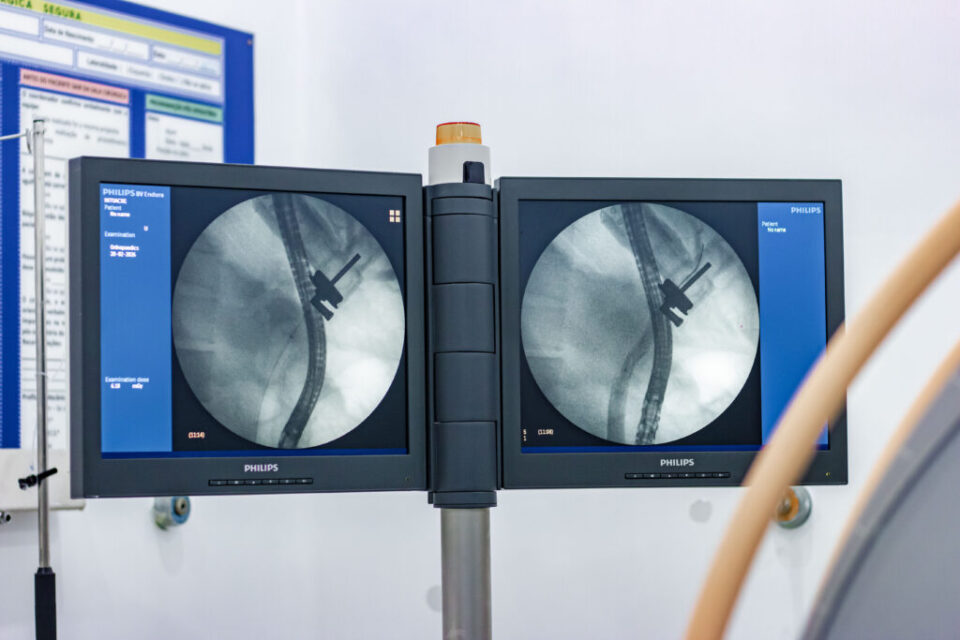 Monitor exibe imagem de radioscopia durante procedimento. Foto: Gleison Luz/Fundhacre