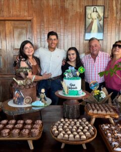 Agropecuarista Jorge Moura e sua Neia Moura reuniu a família em torno do aniversário do neto Mourinha, filho do Marcelo. Mourinha completou seus 18 anos e já trabalha ao lado do avô para dar continuidade aos negócios da família. Filho de peixe….