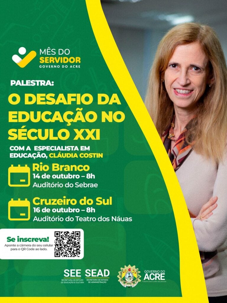Em alusão ao Mês do Servidor, celebrado em outubro, o governo do Acre, por meio das secretarias de Estado de Administração (Sead) e de Educação e Cultura (SEE), promoverá nos dias 14 e 16 de outubro, em Rio Branco e Cruzeiro do Sul, a palestra “O Desafio da Educação no Século XXI”, ministrada pela especialista em educação Cláudia Costin.