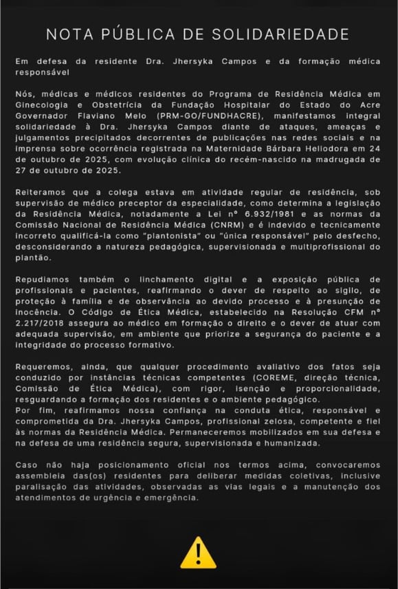 Em um movimento de solidariedade e defesa da formação médica, os residentes do Programa de Ginecologia e Obstetrícia da Fundação Hospitalar do Estado do Acre (Fundhacre) divulgaram uma Nota Pública de Solidariedade em apoio à Dra. Jhersyka Campos. A residente tem sido alvo de intensa onda de ataques e “julgamentos” nas redes sociais e na imprensa local, após o óbito de um recém-nascido na Maternidade Bárbara Heliodora, em Rio Branco, no último fim de semana.