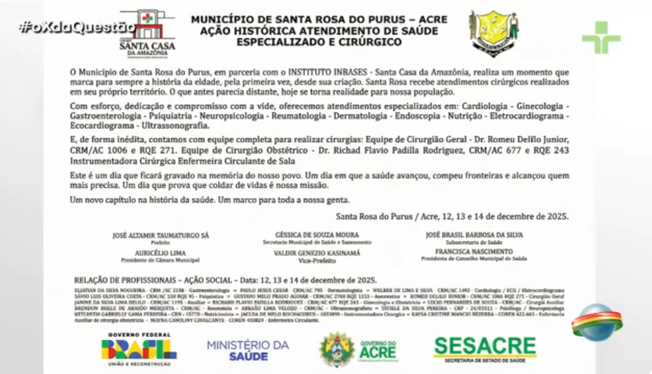 O programa “O X da Questão”, de domingo, 14, transmitido pela TV Rio Branco, canal 8.1, e Rádio Cidade FM 107.1, conduzido pelo jornalista e apresentador José Alex e com a participação do renomado jornalista Antônio Muniz, destacou neste domingo uma ação humanitária sem precedentes no interior do Acre. Pela primeira vez desde a sua fundação, o município de Santa Rosa do Purus, um dos mais isolados do estado, foi palco de procedimentos cirúrgicos realizados localmente.